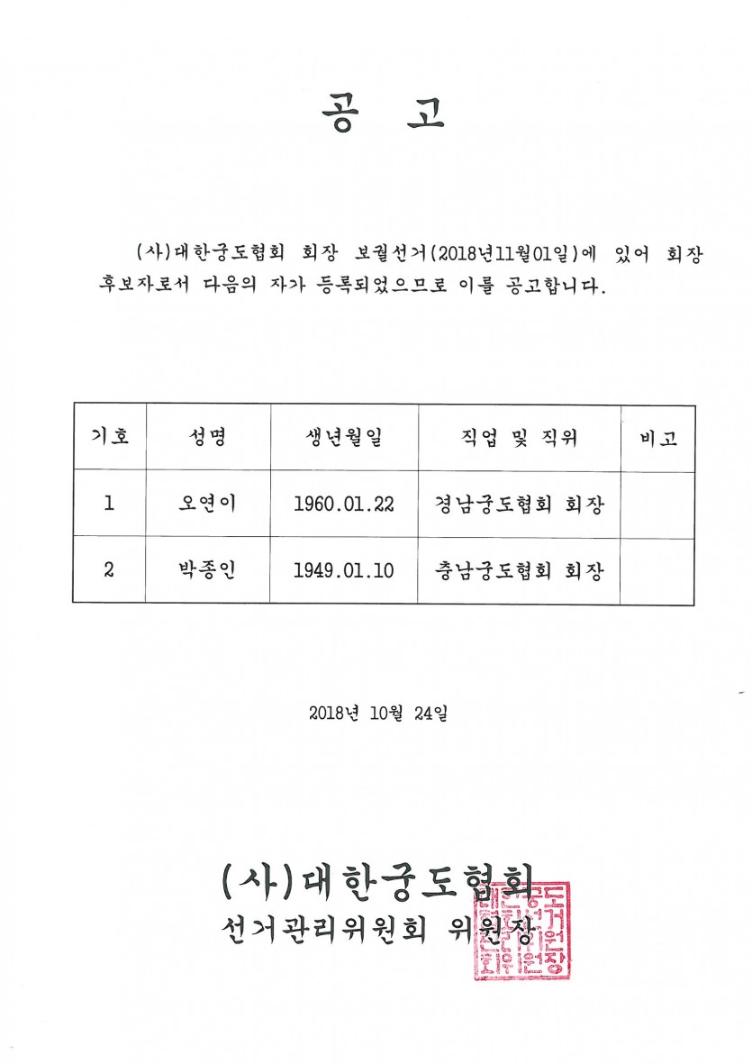 (사)대한궁도협회 회장 보궐선거(2018년11월01일)에 있어 회장 후보자로서 다음의 자가 등록되었으므로 이를 공고합니다.