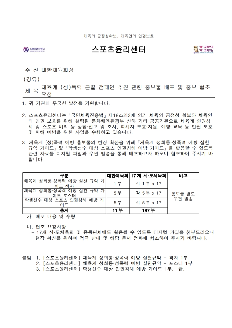 체육계 (성)폭력 근절 캠페인 추진 관련 홍보물 배포 및 홍보 안내입니다.