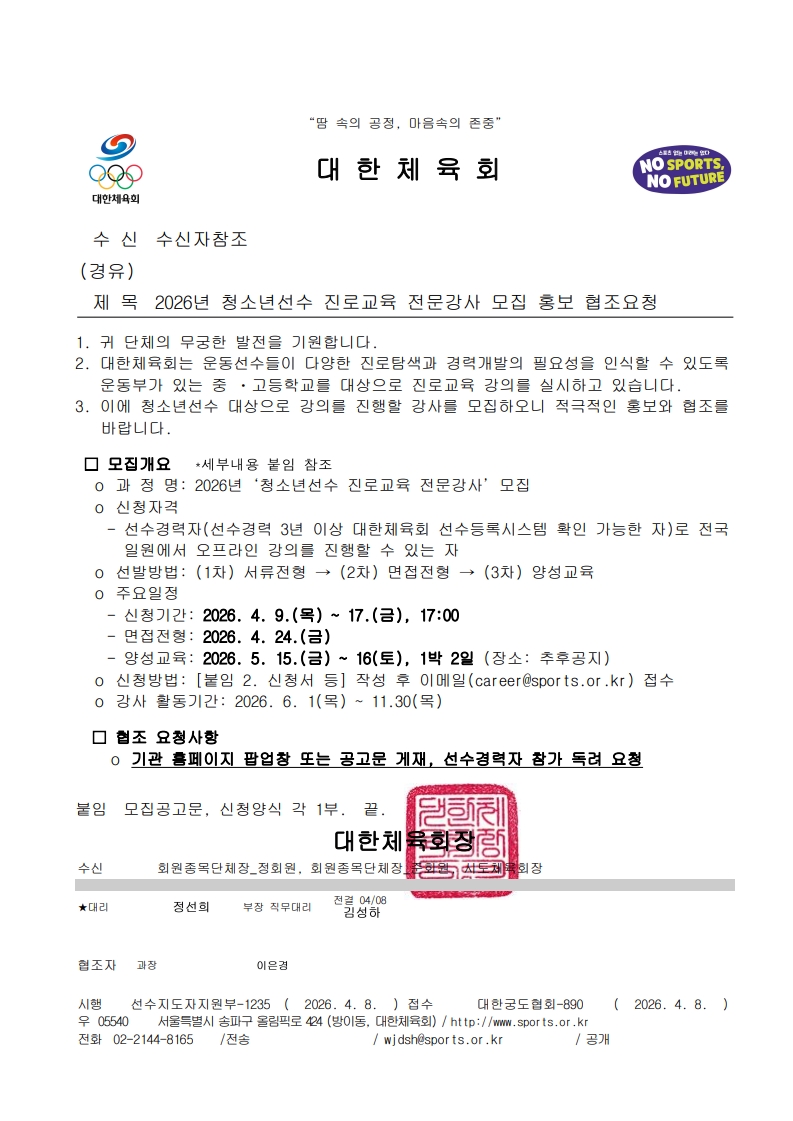 2026년 청소년선수 진로교육 전문강사 모집 안내 및 홍보